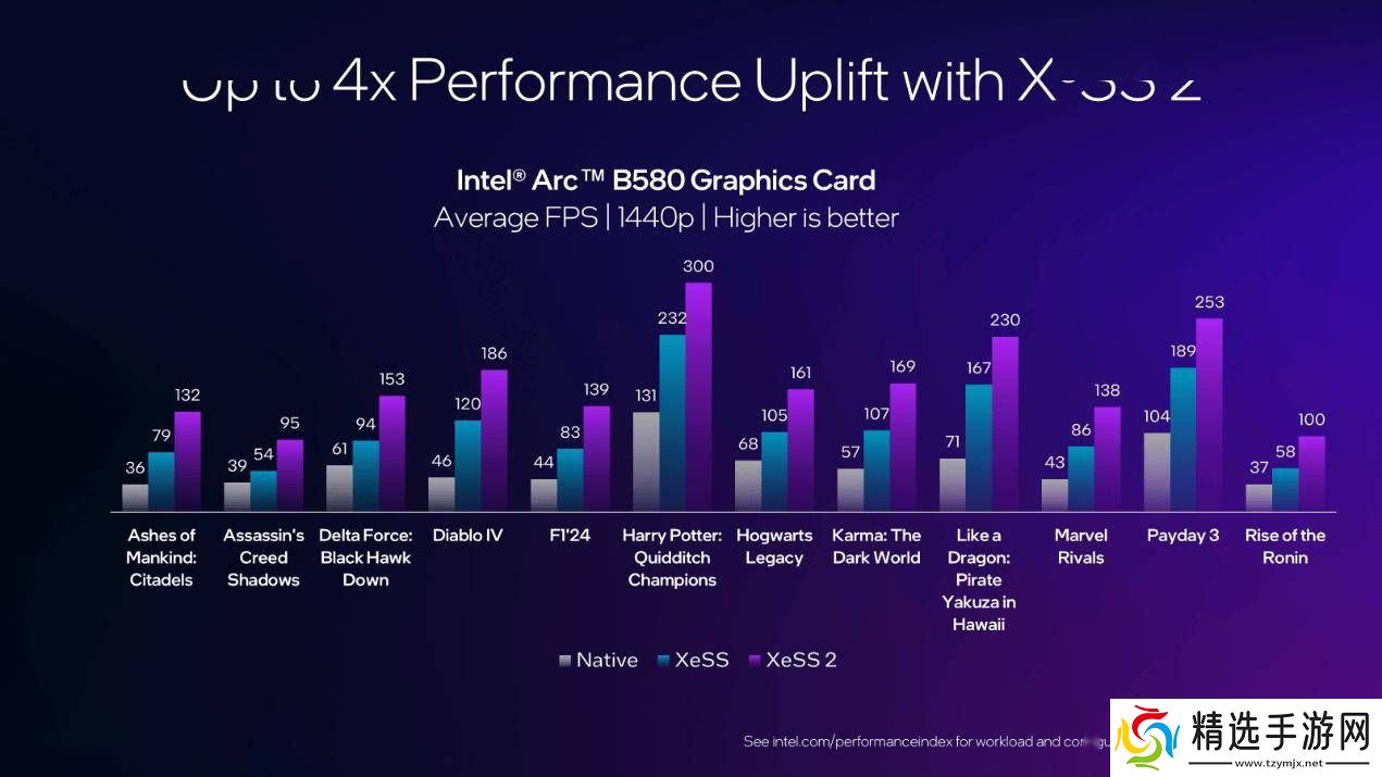 在英特尔锐炫B580显卡的实测中,XeSS 2技术的表现尤为亮眼。多款热门游戏在XeSS 2的加持下,帧率稳定性得到了显著提升。《暗黑破坏神 IV》的帧率实现了4倍的增长,而全新大作《刺客信条:影》也获得了2.4倍的帧率提升,为玩家带来了更加流畅的游戏体验。