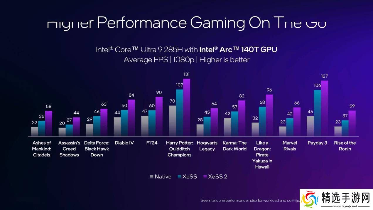 搭载英特尔锐炫GPU的英特尔酷睿Ultra处理器(第二代)也全面支持XeSS 2技术。以英特尔酷睿Ultra 9 285H处理器为例,该处理器内置英特尔锐炫140T GPU,在相同游戏测试中,帧率稳定保持在40帧以上,多款大作更是突破了60帧大关。其中,《漫威争锋》在高画质模式下,帧率从原生的23帧跃升至XeSS 2加持下的66帧,提升幅度高达187%。