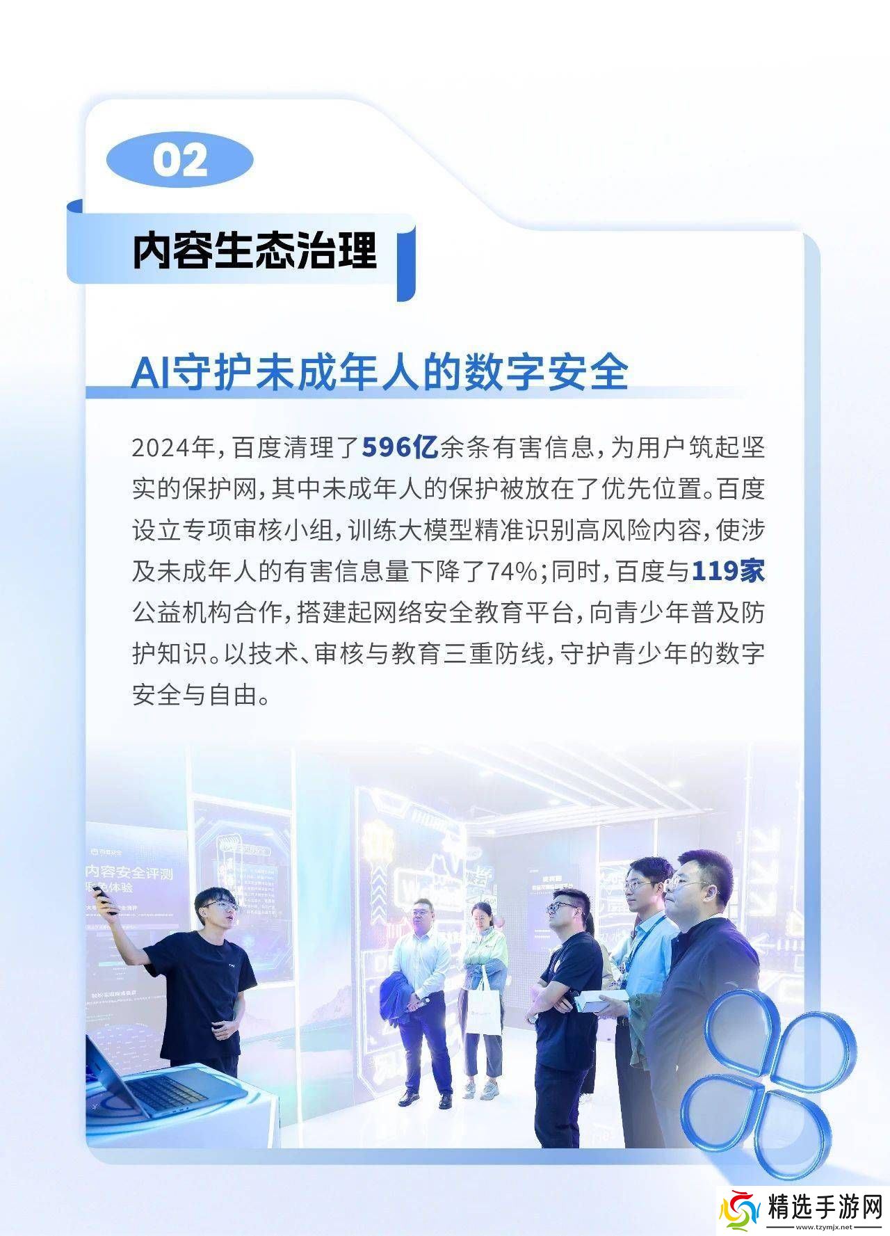 在生态治理方面,百度同样不遗余力。报告指出,2024年,百度清理了有害信息多达596亿条,尤其重视未成年人的网络保护。为此,公司专门设立了审核小组,利用先进的大模型技术,精准识别并有效降低了涉及未成年人的有害信息量,降幅高达74%。同时,百度携手119家公益机构,共同搭建网络安全教育平台,致力于提升青少年的自我保护能力。
