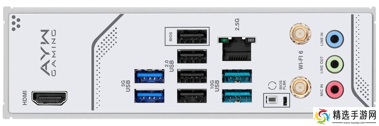 在外部I/O接口方面,主板提供了丰富的选项。板内接针包括1个USB-C 5Gbps接口(支持15W供电)、1个一分二USB-A 5Gbps接口和2个一分二USB-A 480Mbps接口。后置接口则包括1个HDMI 2.1 TMDS接口、2个USB-A 5Gbps接口、4个USB-A 480Mbps接口、2个USB-A 10Gbps接口、1个2.5GbE RJ45网络接口、一对Wi-Fi天线插孔以及3个音频插孔。主板还提供了BIOS FlashBack按键,方便用户进行BIOS更新。