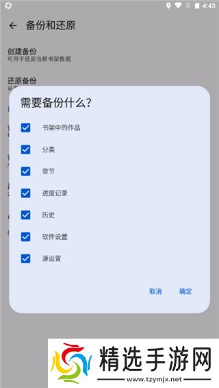 4、点击创建备份后,还能选择备份的作品类型,章节、历史、分类、源设置等等。