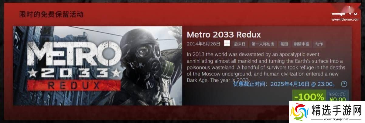 近期,为纪念备受欢迎的《地铁》系列游戏诞生15周年,Steam与GOG平**合推出了一项特别活动。《地铁 2033 复刻版》(Metro 2033 Redux)这款经典游戏,现已在两个平台上开放限时免费领取,活动持续时间为48小时。