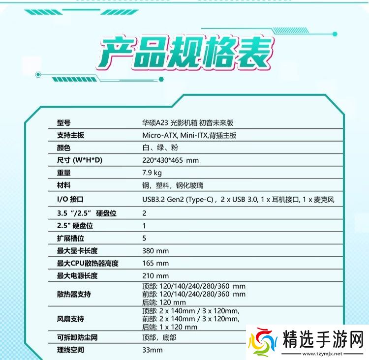 据华硕介绍,这款机箱采用了初音未来深度定制,包括定制 MIKU 剪影立绘、领带式样耳机挂架、洞洞板音符配饰以及其他定制细节设计。