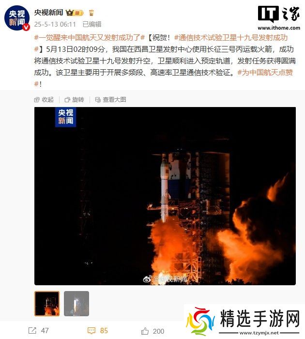 本站 5 月 13 日消息,今日凌晨 2 时 09 分,我国在西昌卫星发射中心使用长征三号丙运载火箭成功将通信技术试验卫星十九号顺利送入地球同步转移轨道,发射任务取得**成功。