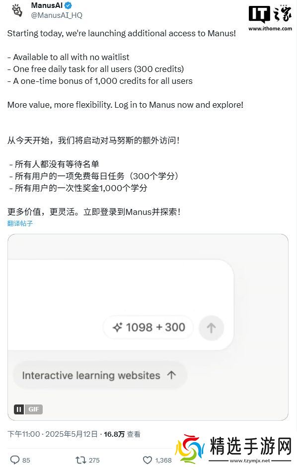Manus 在公告中表示,Manus 即日起面向所有人开放,无需等待;所有用户每天可免费执行一项任务(300 积分),新用户可额外获得 1000 积分的一次性奖励