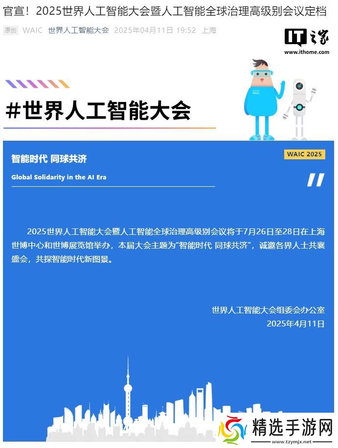 本站 4 月 11 日消息,2025 世界人工智能大会暨人工智能全球治理高级别会议将于 7 月 26 日至 28 日在上海世博中心和世博展览馆举办,本届大会主题为“智能时代同球共济”。