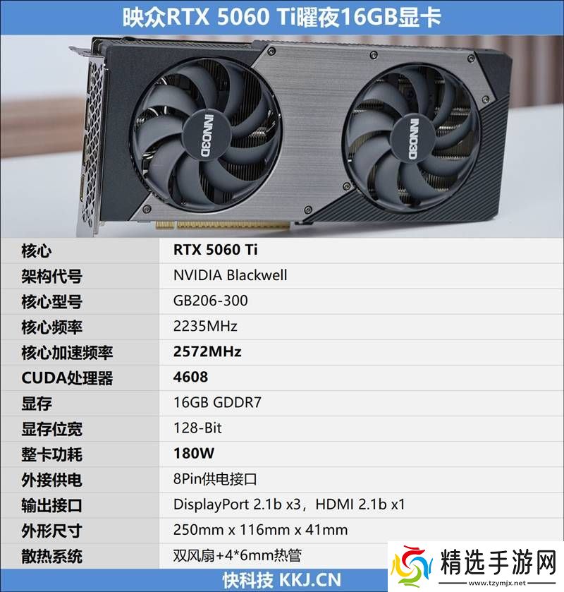 映众RTX 5060 Ti曜夜16GB显卡搭载了NVIDIA Blackwell架构的RTX 5060 Ti GPU,核心编号为GB206-300,拥有36组SM单元和4608个CUDA核心。它还配备了144个第5代Tensor Core和36个第4代RT Core,支持PCIe 5.0接口,显存带宽达到448GB/s。