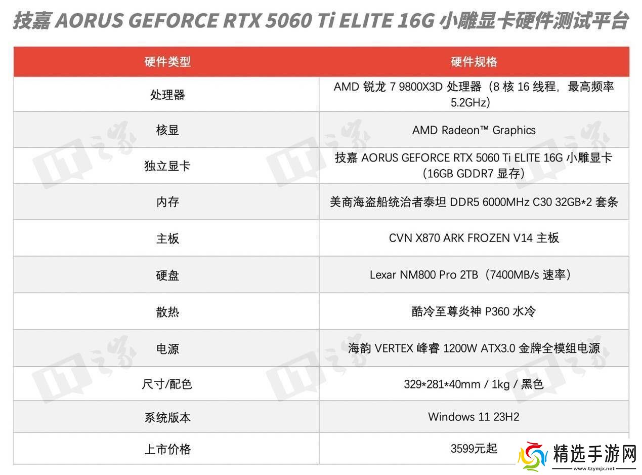 为了充分发挥显卡性能,我们搭建了一个高性能硬件测试平台。技嘉AORUS GEFORCE RTX 5060 Ti ELITE 16G显卡延续了小雕系列的硬朗电竞风格,纯黑配色搭配不规则银白点缀,显得既纯粹又统一。显卡正面装甲部分还设计了棱型格纹,增加了层次感。三把97mm大尺寸仿生风扇和隐藏的RGB灯环,使显卡不仅性能出色,外观也十分酷炫。