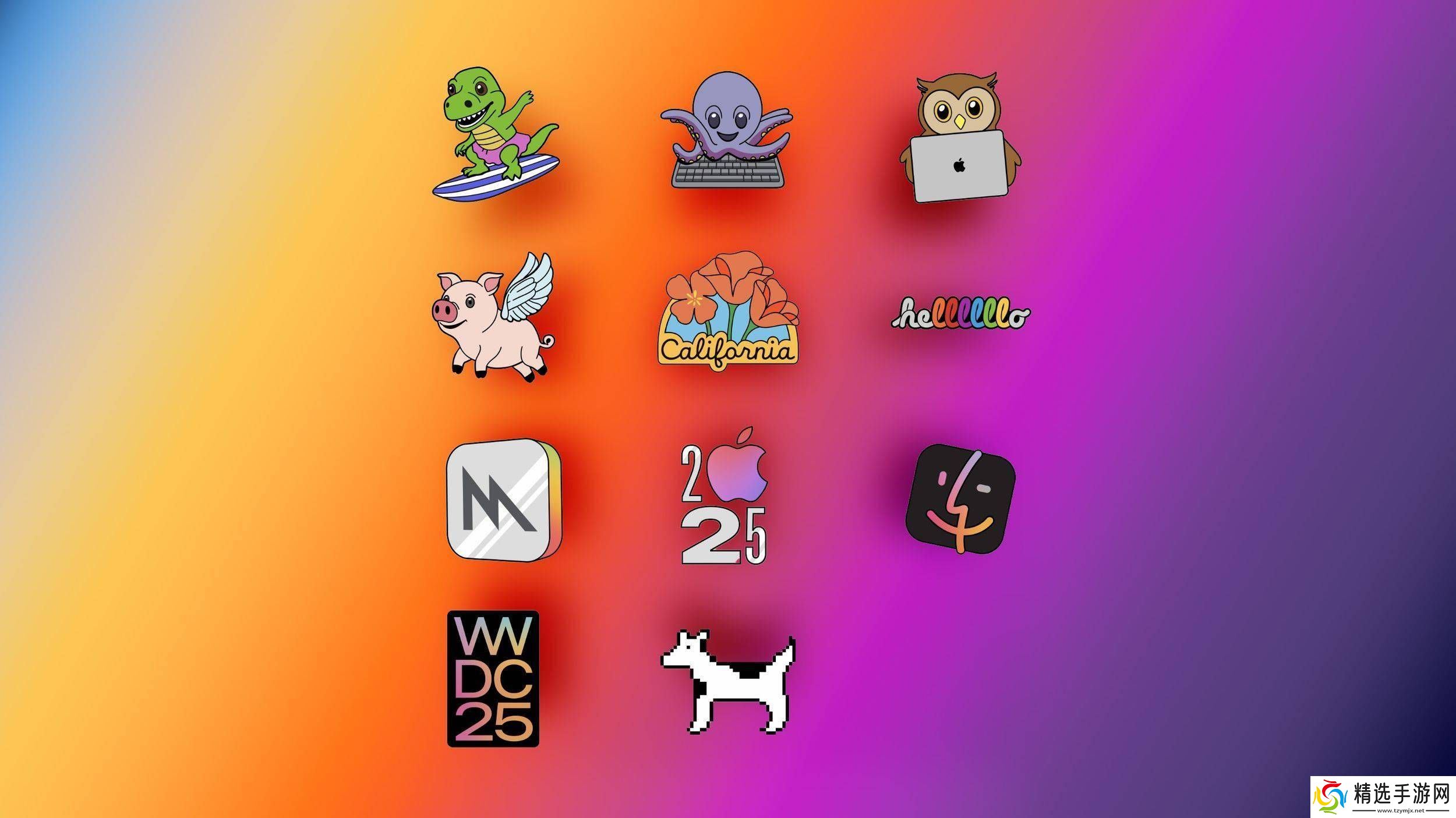苹果还延续了往年的传统,在Messages App中推出了全新的Genmoji风格贴纸。这些贴纸设计独特且富有创意,包括冲浪的恐龙、敲键盘的章鱼、飞翔的猪等动画形象,还有色彩鲜明的“Hello”贴纸和融入加州花菱草元素的“California”贴纸,为用户的聊天增添了无限乐趣。