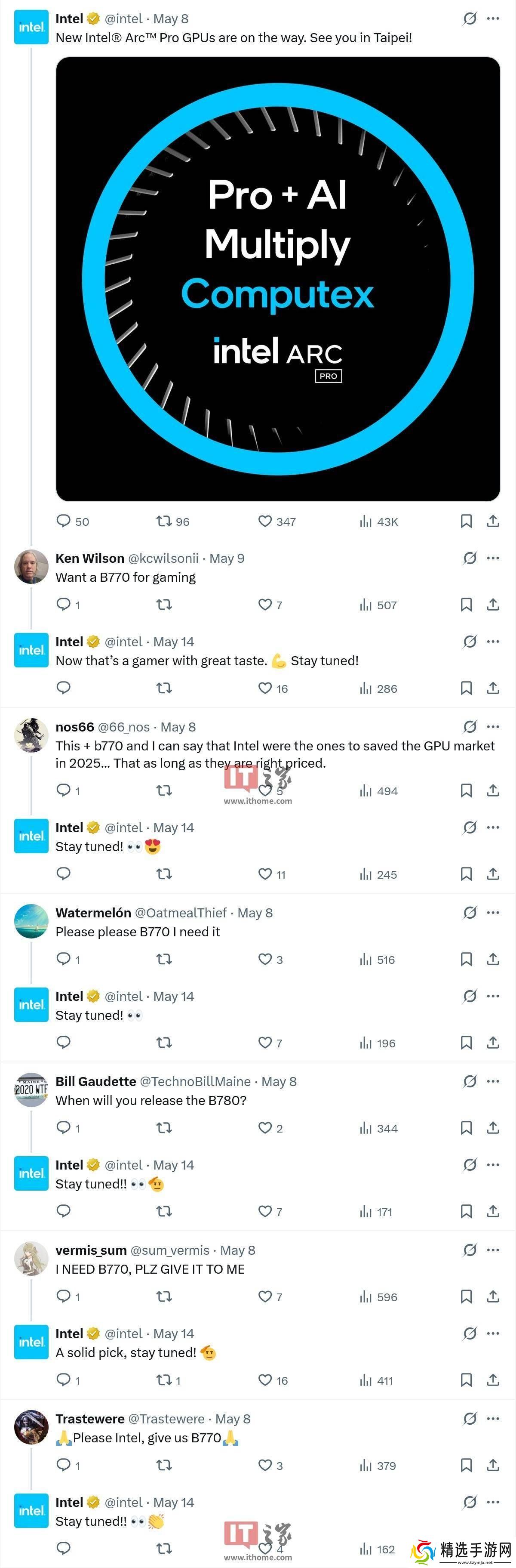 此消息一出,立即引发了众多网友的热议。特别是在英特尔 X 平台动态的评论区,网友们纷纷表达了对英特尔中高端“Battlemage”架构消费级独立显卡产品的热切期待。网友们提及的型号如 B770、B780 等,成为了大家讨论的焦点。面对网友们的热情期待,英特尔官方 X 平台账户也在近日统一回复道:“敬请期待!”这一回复无疑进一步点燃了网友们的热情。