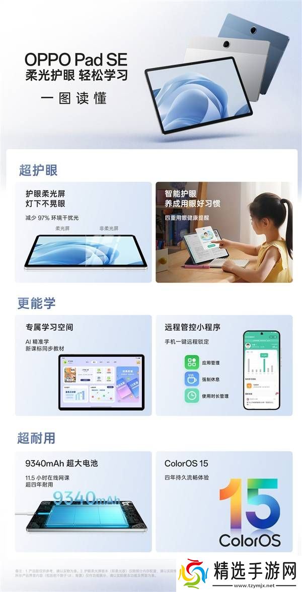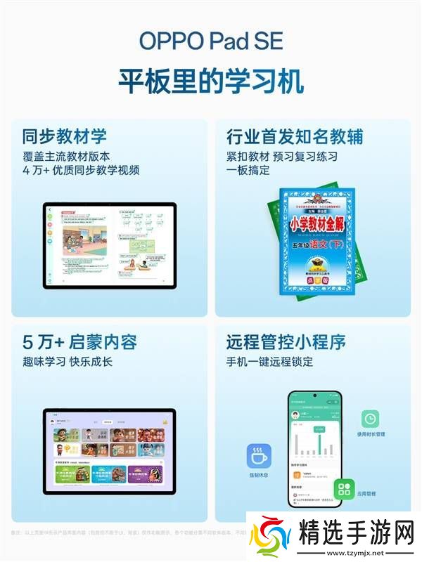 OPPO Pad SE还针对学习场景进行了专门优化。设备支持专属学习空间,内置了从小学到高中全学科的新课标同步教材,并具备课文点读等功能。家长还可以通过“家庭空间”小程序对设备进行远程管控,包括设置使用时长、屏蔽不良网站等,为孩子营造一个健康、安全的学习环境。