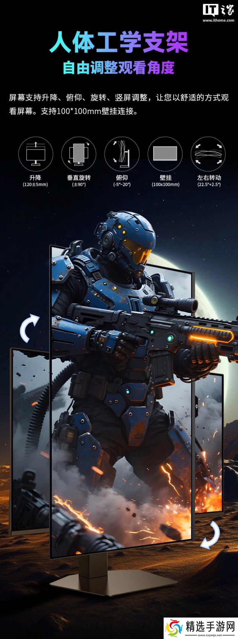 该机支架支持升降 / 倾斜 / 旋转,显示器提供了氛围灯,同时支持VESA壁挂,配备1个 DP 1.4、2个 HDMI 2.1接口、1个 3.5mm音频接口。