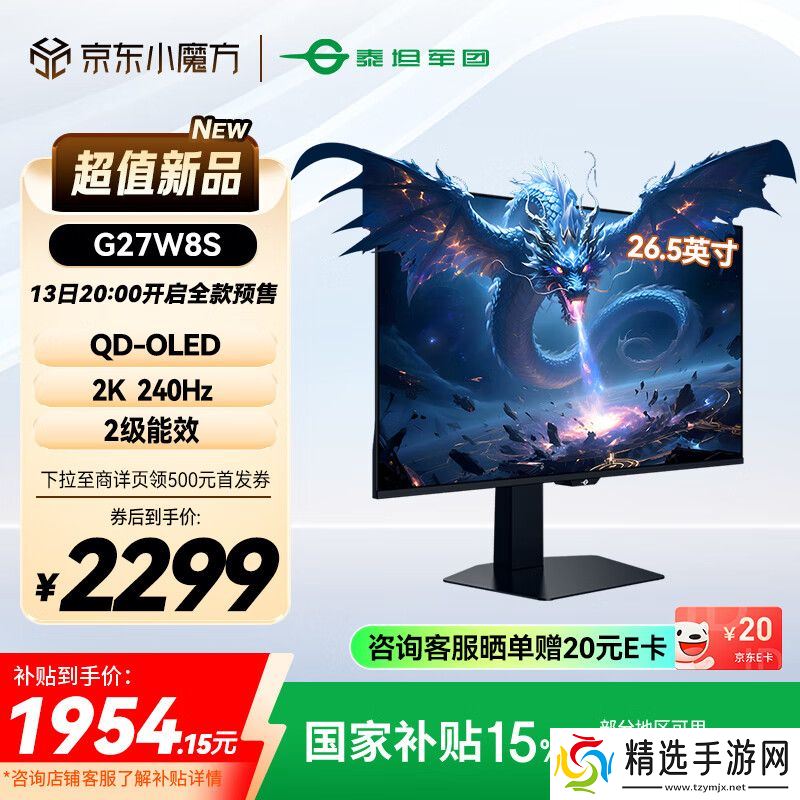本站 5 月 17 日消息,泰坦军团现已在京东上架“G27W8S“26.5英寸显示器,这款显示器主打”2K 240Hz QD-OLED”,定价为2799元,商品详情页可领取 500 元首发券,首发券后到手价 2299 元,之后参与8.5折国家补贴,实付低至 1954.15 元,晒单赠 20 元 E 卡,到手价低至1934.15元。