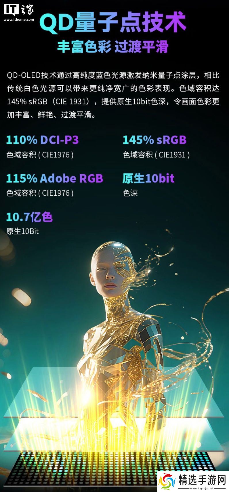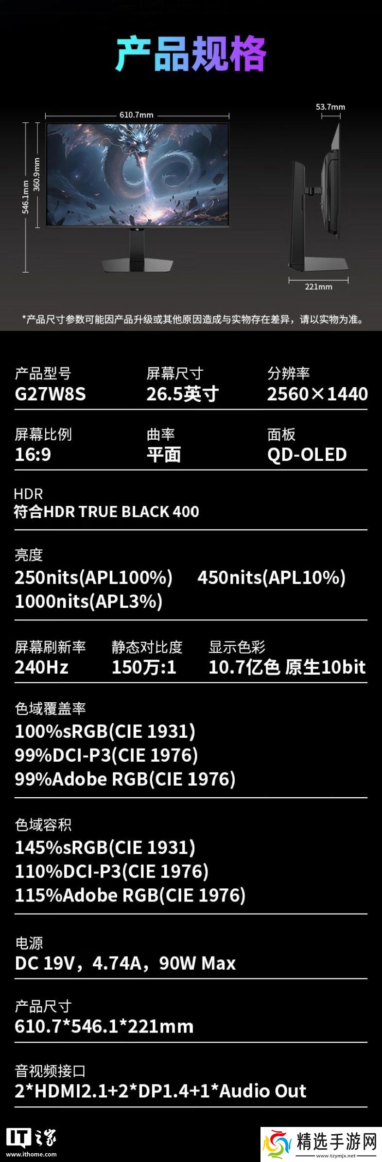 这款显示器配备一块2560x1440分辨率240Hz QD-OLED面板,亮度至高1000尼特,静态对比度150 万:1,显示器支持原生10-Bit色彩,覆盖100% sRGB、99% DCI-P3、99% Adobe RGB色域。