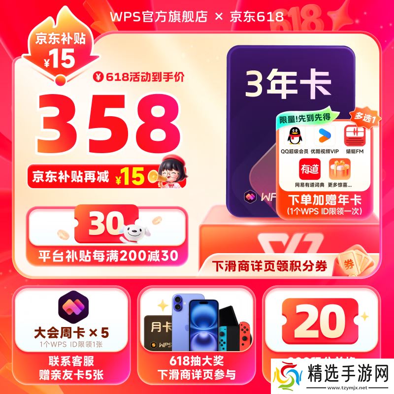 京东WPS 大会员 3 年卡加赠会员 5 选 1295.4 元领 15 元券腾讯视频 x 京东