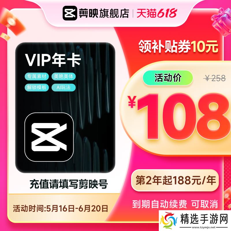 天猫剪映 VIP 会员年卡需要手动取消自动续费 20:00 108 元直达链接SVIP 支持 App +电脑端使用,官方 499 元 / 年。