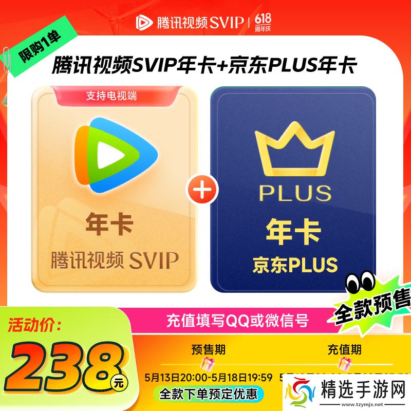京东腾讯视频 SVIP + 京东 PLUS 年卡支持电视端 618 大促 238 元直达链接爱奇艺 x 京东