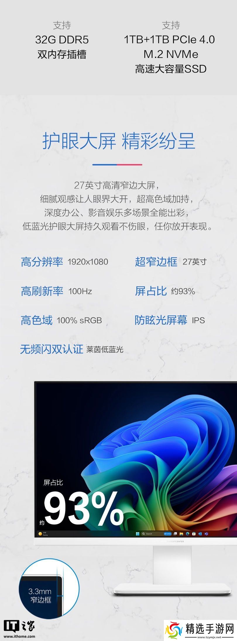 该机定位入门级,整体采用白色风格,提供杜比音效,支持Wi-Fi 6E和蓝牙5.3技术,配有键盘和鼠标。