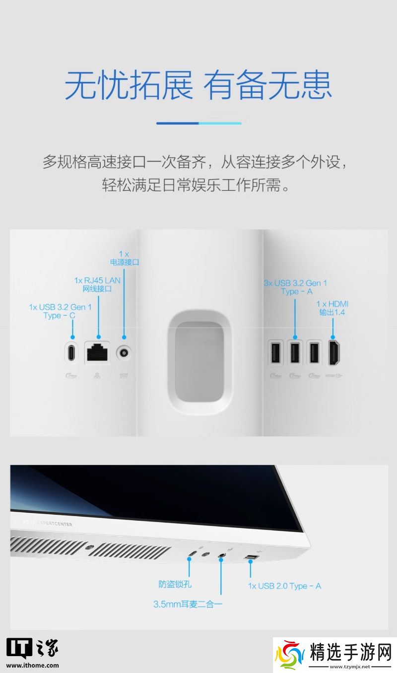 I/O方面,该机后侧搭载1个 USB-C 3.2 Gen 1接口、1个 RJ45网口、3个 USB-A 3.2 Gen 1接口、1个 HDMI 1.4接口。底部搭载 1个 3.5mm音频接口、1个 USB-A 2.0接口。