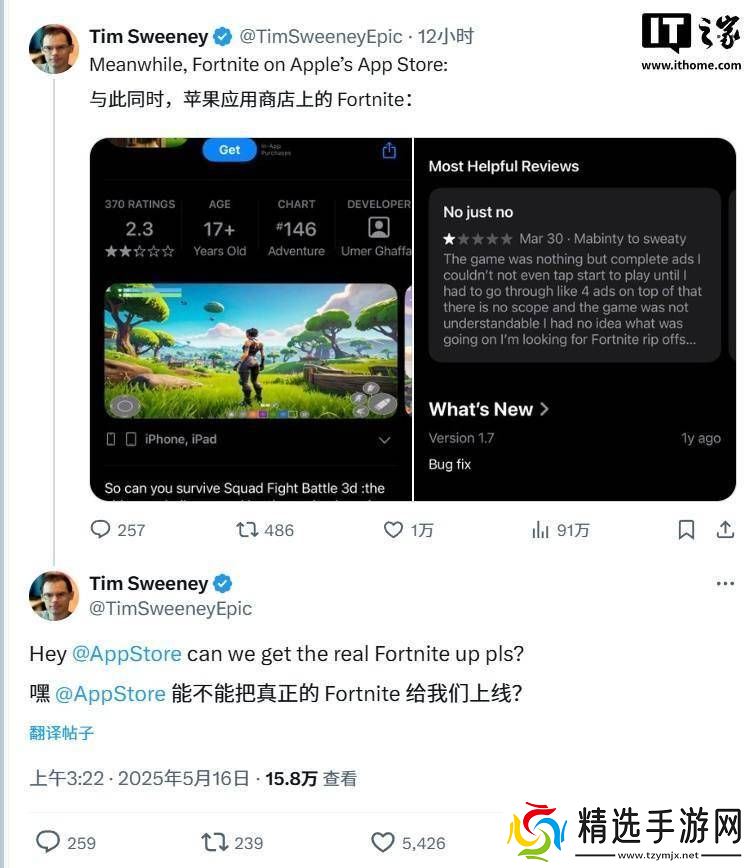 近期,Epic Games与苹果之间的纠葛再次升级,焦点集中在《堡垒之夜》这款游戏能否顺利重返美国iOS App Store。自4月30日Epic与苹果的诉讼案裁定苹果不得对App Store以外的购买收取佣金后,Epic Games首席执行官蒂姆·斯威尼曾宣布,《堡垒之夜》即将在下周重新登陆iOS平台。