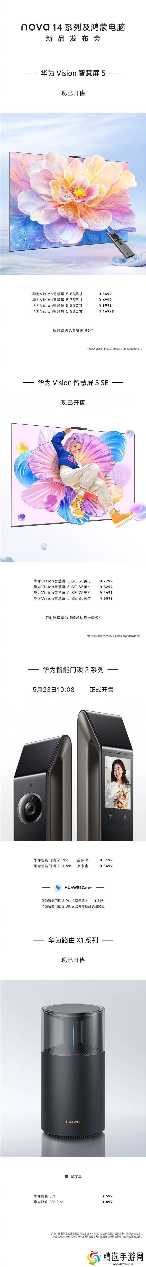 智能家居产品同样不容小觑。华为Vision智慧屏5系列提供了从65英寸到98英寸的不同尺寸选择,价格范围在5499元到16999元之间。而更为经济实惠的Vision智慧屏5 SE系列,其55英寸版本仅需2799元。华为还推出了两款智能门锁,智能门锁2 Pro售价为3199元,而更高端的智能门锁2 Ultra则定价为3699元。