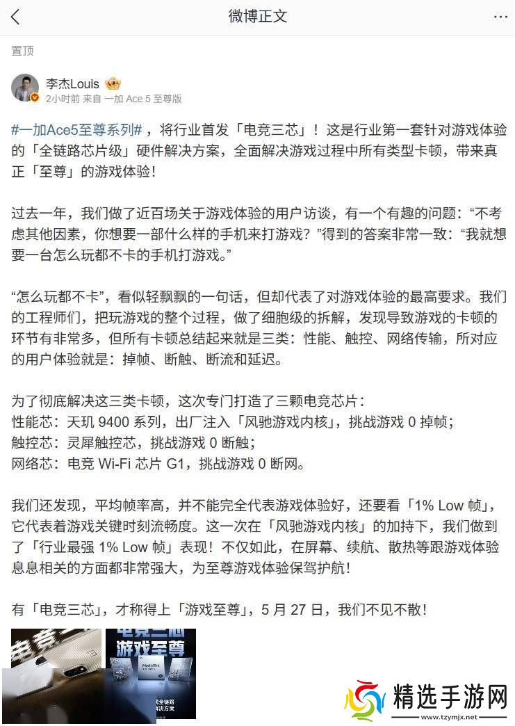 一加中国区总裁李杰Louis在微博上透露,一加 Ace5 至尊系列将行业首发“电竞三芯”。这一创新性的设计,旨在全面解决游戏过程中可能遇到的各种卡顿问题,确保玩家在游戏过程中享受到极致流畅的体验。李杰表示,这一解决方案是行业第一套针对游戏体验的“全链路芯片级”硬件方案。