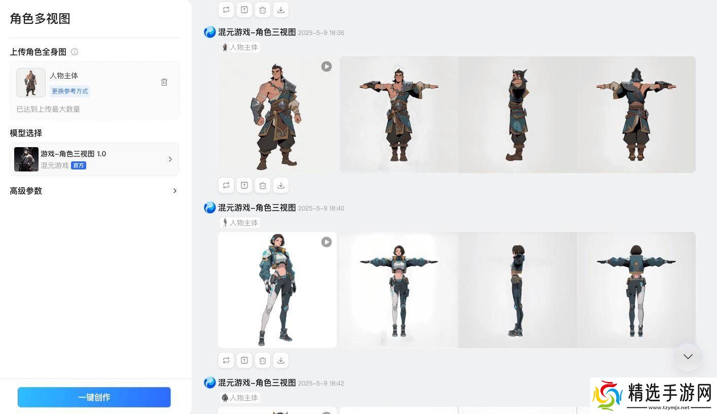 混元游戏平台还具备强大的角色多视图生成能力。传统游戏美术设计流程中,游戏美术设计师需要针对人物绘制三视图。而现在,设计师仅需上传单张角色原画,混元AI即可一键生成符合行业规范的标准三视图及360°旋转视频,用于后续的3D建模。这一过程耗时从传统的12小时缩短至几分钟到30分钟,主体一致性高达99%。