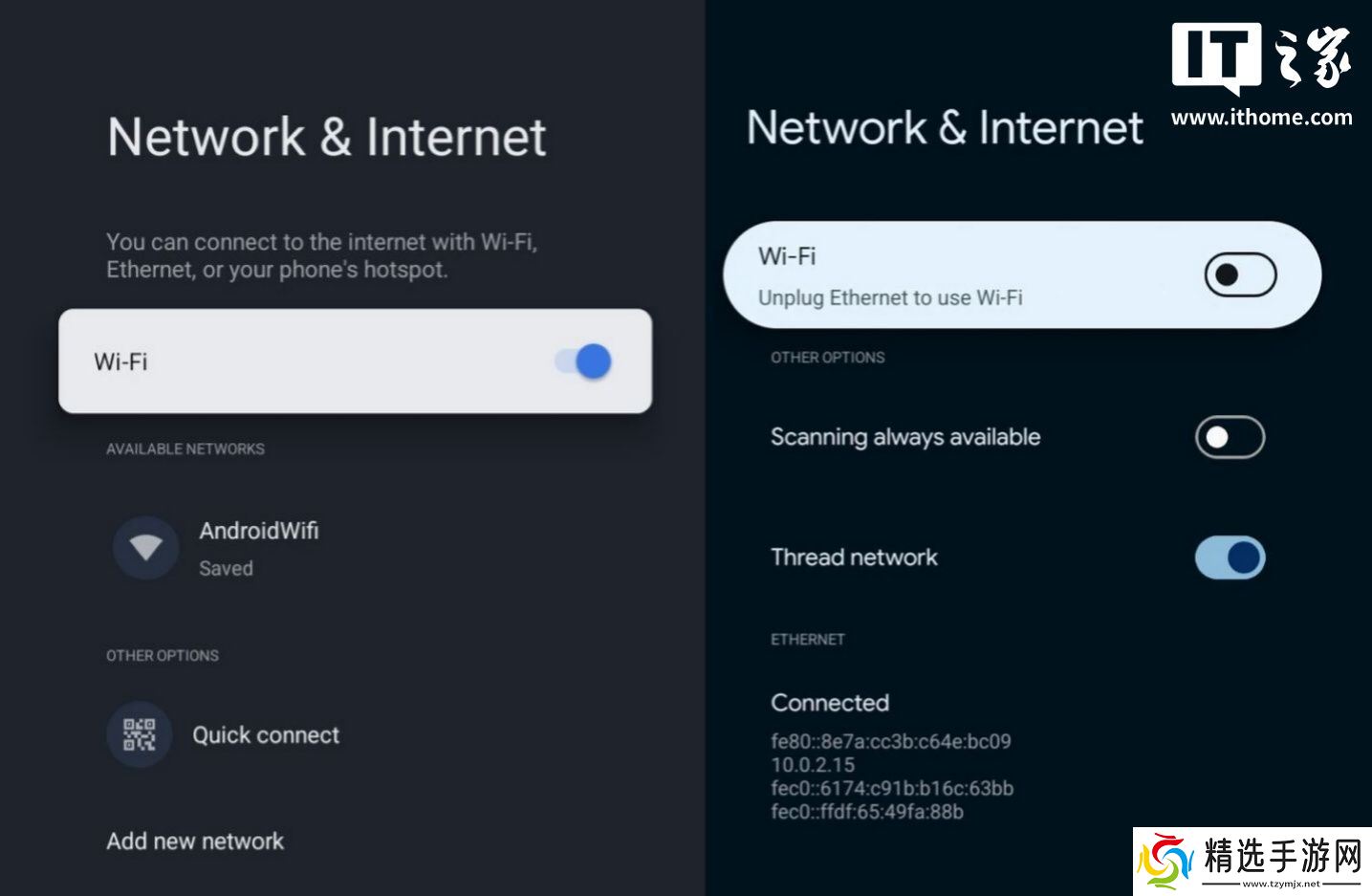 本次更新在用户界面上的变化仅限于设置菜单,其他方面暂无明显改进,不过在系统底层优化方面,带来了多项改进:MediaQualityManager 支持开发者控制选取画面配置文件;新增 Eclipsa Audio codec 支持,创作者可使用 IAMF 空间音频格式;提升媒体播放速度、一致性和效率;优化 HDMI-CEC 可靠性及 64 位内核性能等等。