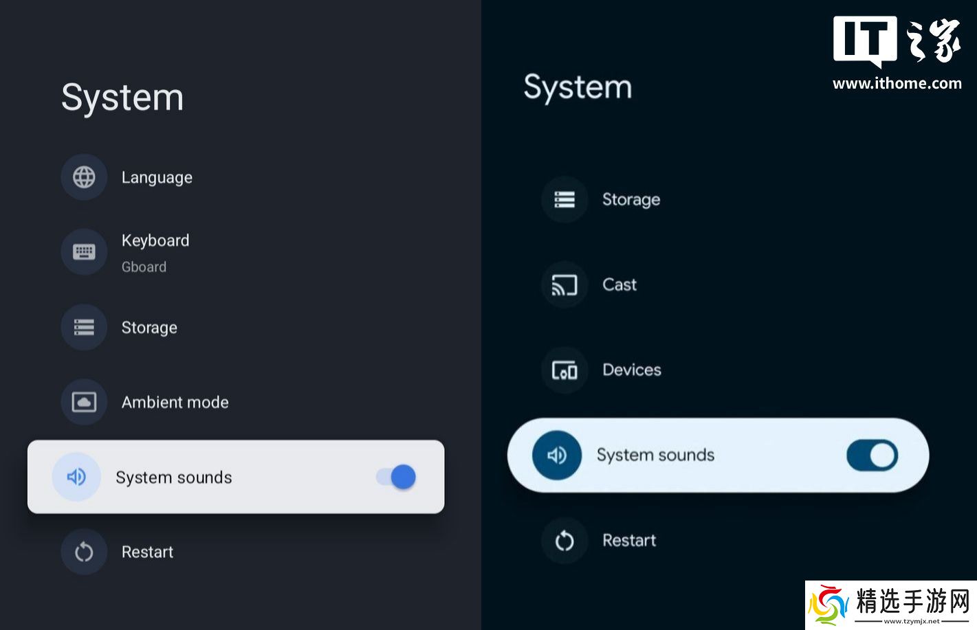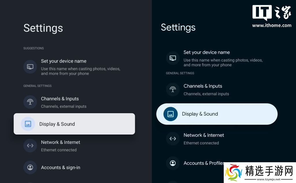 全新设置菜单虽然不像手机更新那样色彩丰富,但新界面焕发出新的活力,每个分区标题以圆角矩形突出显示,图标从之前的浅色设计改为深色圆圈,开关按钮也采用了安卓 16 手机上的全新样式,彻底告别 Android TV OS 14 的过时设计。本站附上对比图如下: