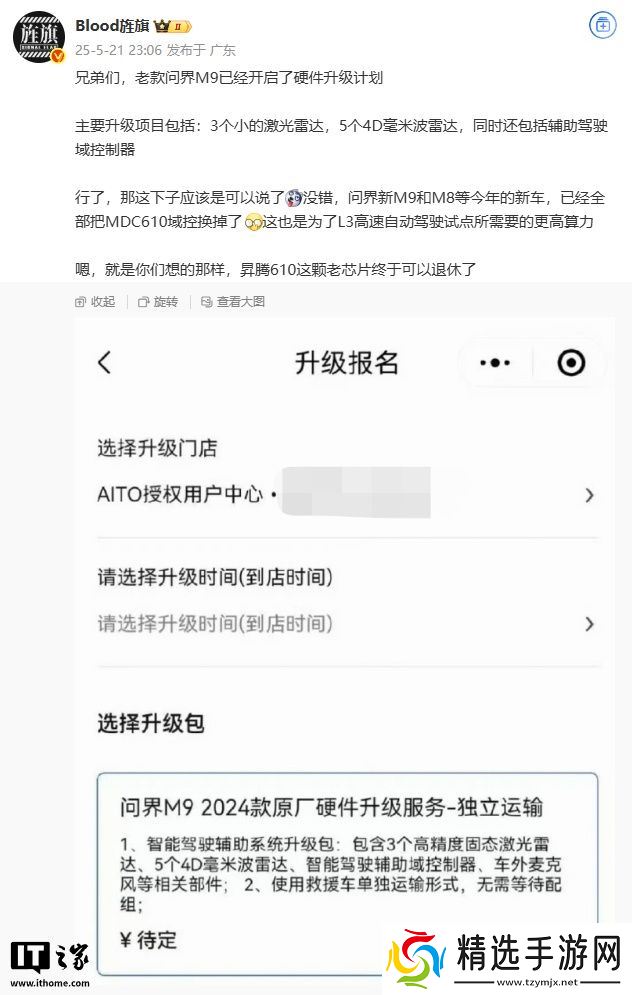 本站 5 月 22 日消息,据多位博主 / 用户分享,老款问界 M9 汽车开启硬件升级报名,相关页面已上线,价格待定。升级包内容如下: