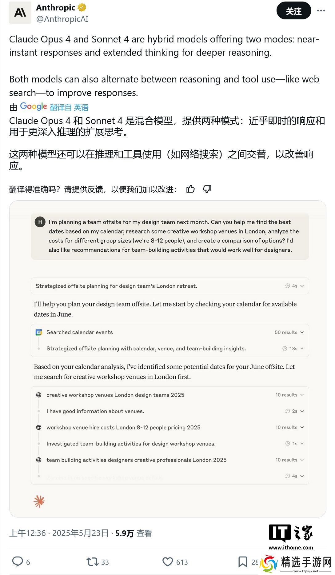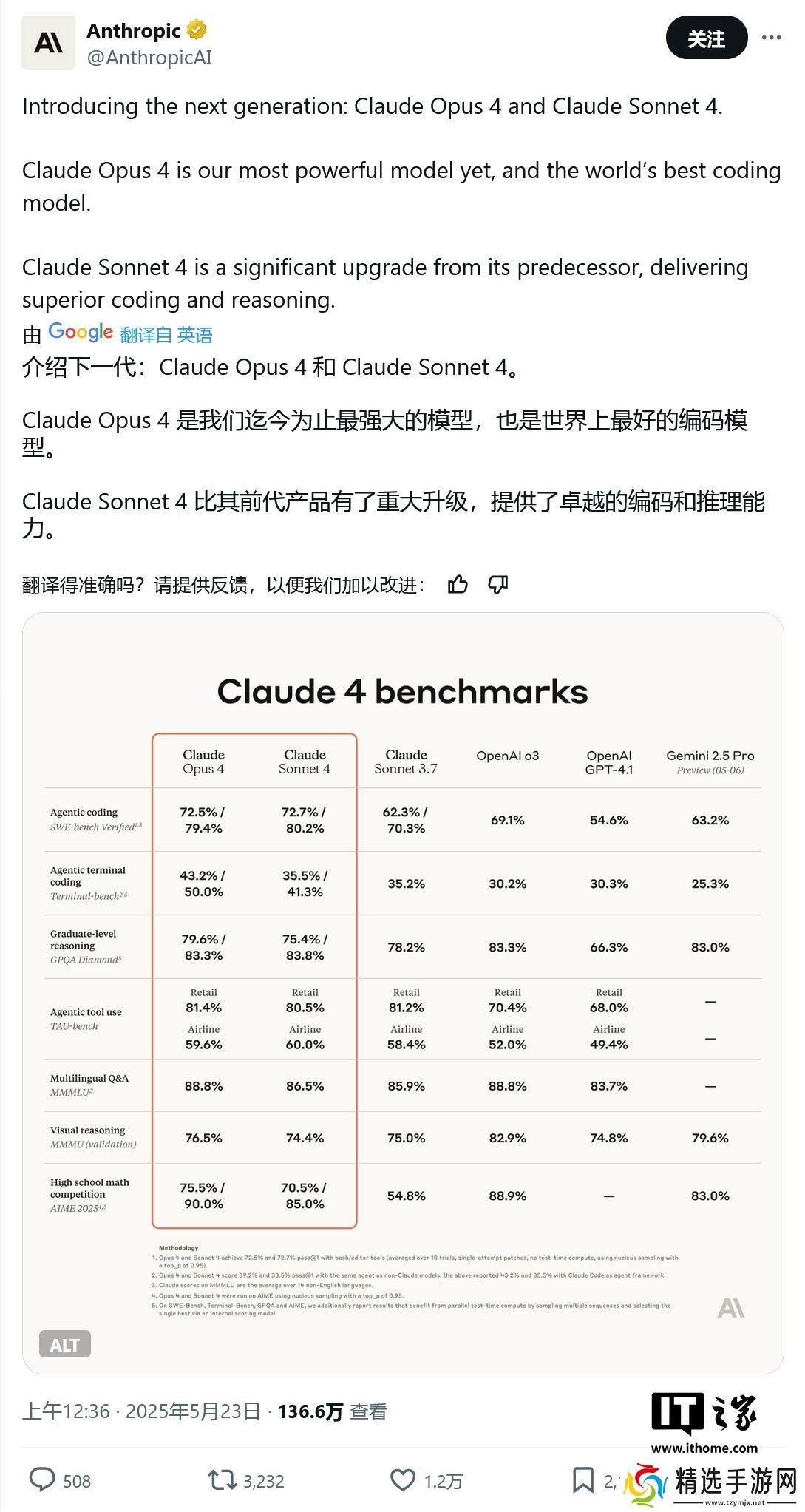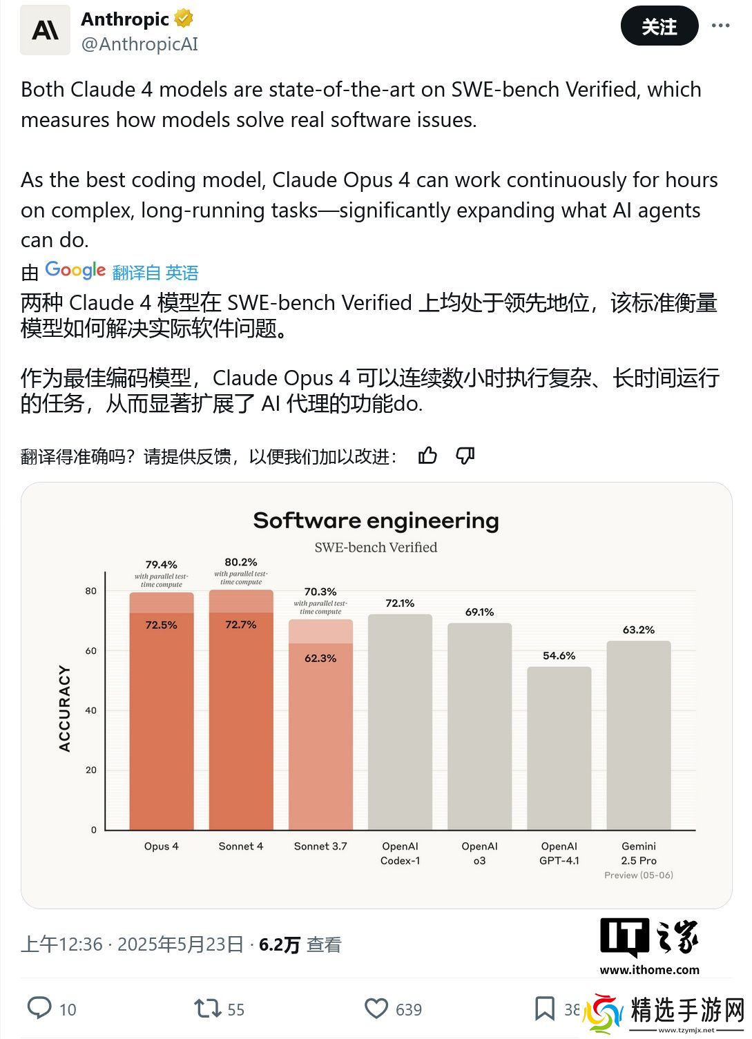 本站援引博文介绍,Claude Opus 4 被定位为 Anthropic 迄今最强大的模型,专为处理复杂的推理流程和软件开发场景设计。