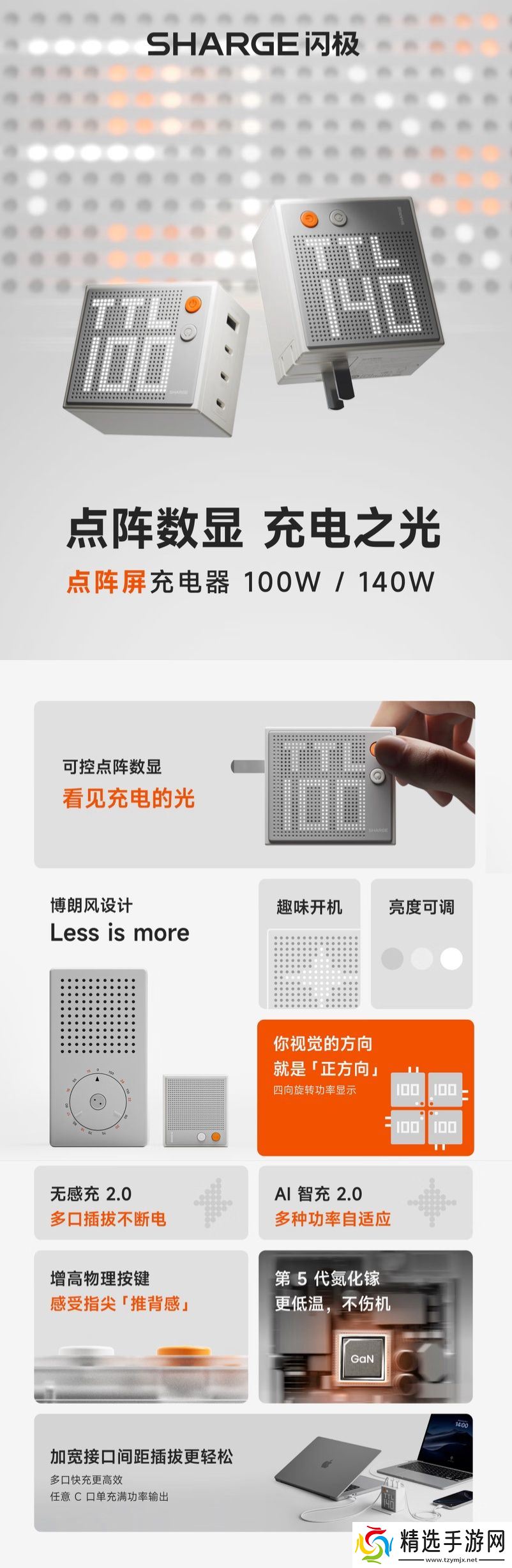 本站 5 月 23 日消息,闪极现已在京东上架一款“点阵屏充电头”,可选100W和140W两种版本,其中 100W采用“3 个 USB-C 和 1 个 USB-A”规格,定价为169元;140W 采用3 个 USB-C 规格,定价为199元。