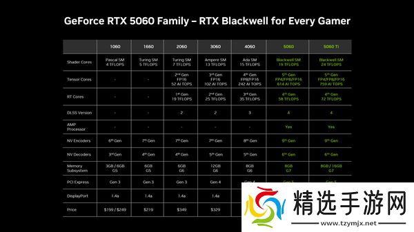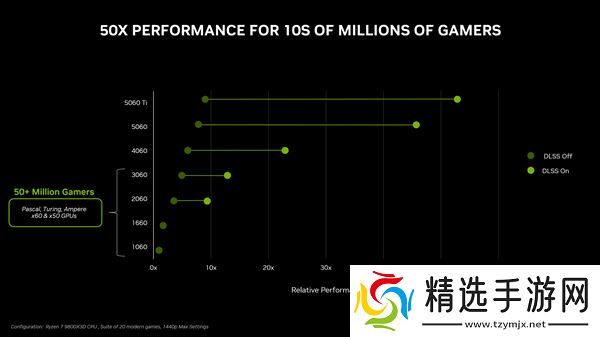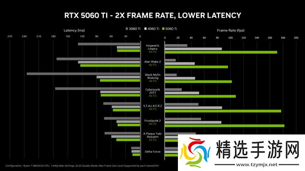 从RTX 5060 Ti的官方性能数据来看,其在性能和延迟方面均表现出色。而与历代x60系列显卡相比,RTX 5060 Ti的性能提升主要得益于DLSS技术的加持。这一技术的引入,不仅提升了显卡的性能表现,更为玩家带来了更为流畅的游戏体验。
