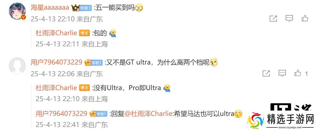 @杜雨泽Charlie 还在评论区回复了部分用户的问题:针对五一能否买到新机,他称“包的”;针对 Pro 不是 Ultra 为什么会高出标准版两档,他表示“没有 Ultra,Pro 即 Ultra”。