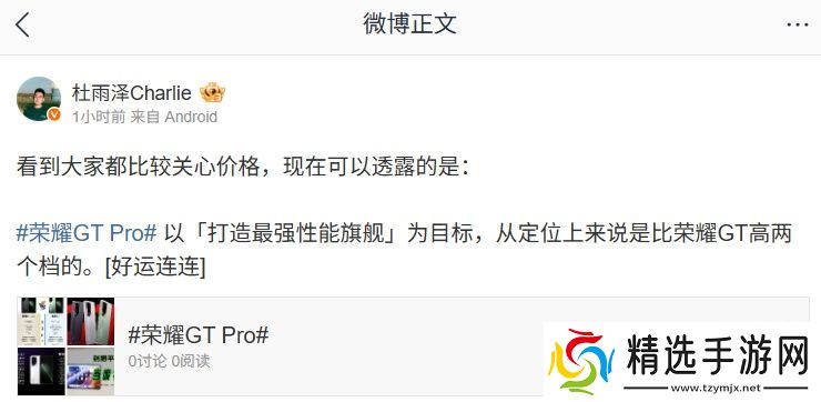 荣耀 GT 系列产品经理@杜雨泽Charlie 今日发文回应了用户所关心的价格问题:“荣耀 GT Pro以「打造最强性能旗舰」为目标,从定位上来说是比荣耀 GT 高两个档的。”由此来看,新机相较于标准版将进一步提高售价(作为参考:荣耀 GT 定价 2199 元起)。