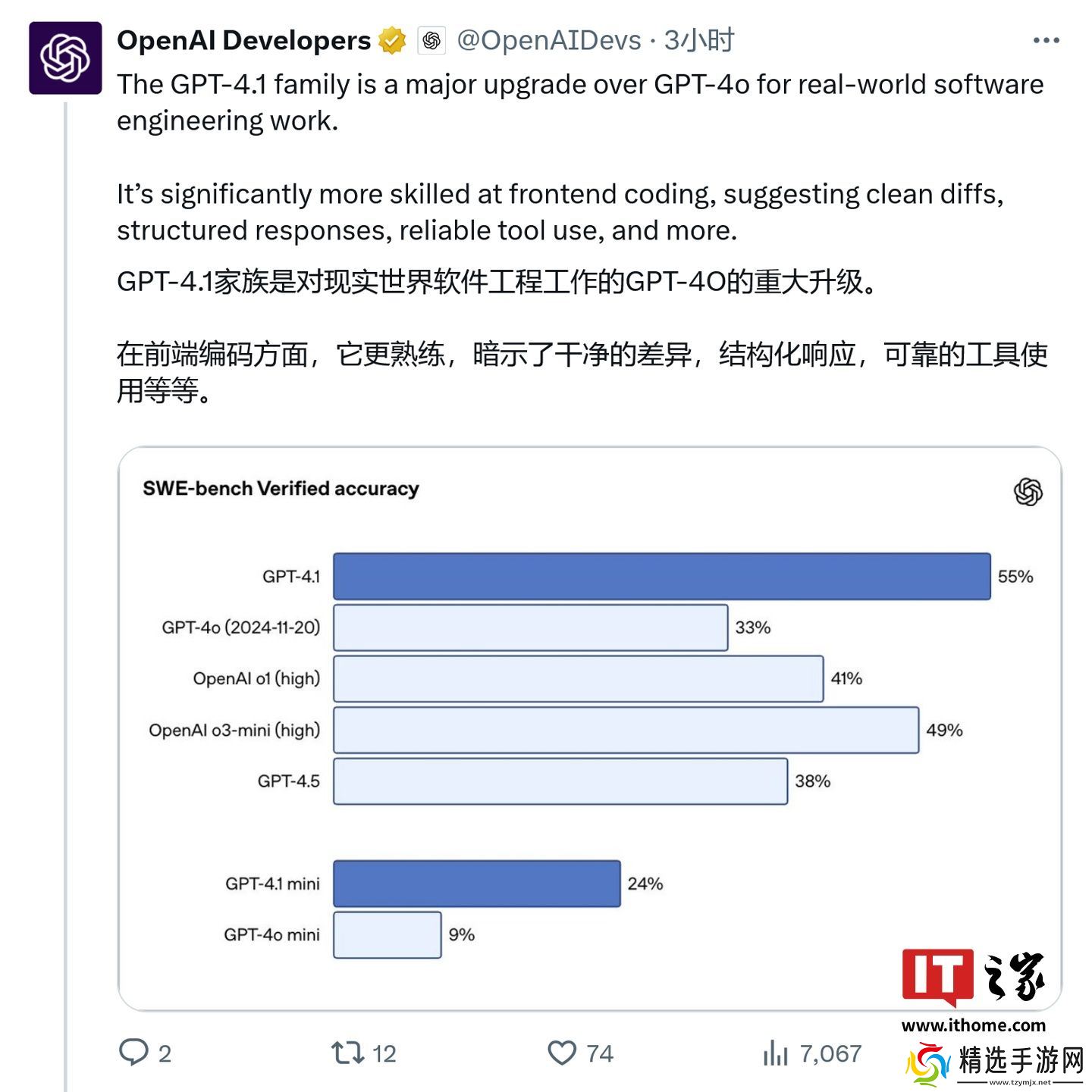 例如在 SWE-bench Verified 跑分中,GPT-4o 的得分为 21.4%,GPT-4.5 的得分为 26.6%,而 GPT-4.1 的得分为 54.6%。