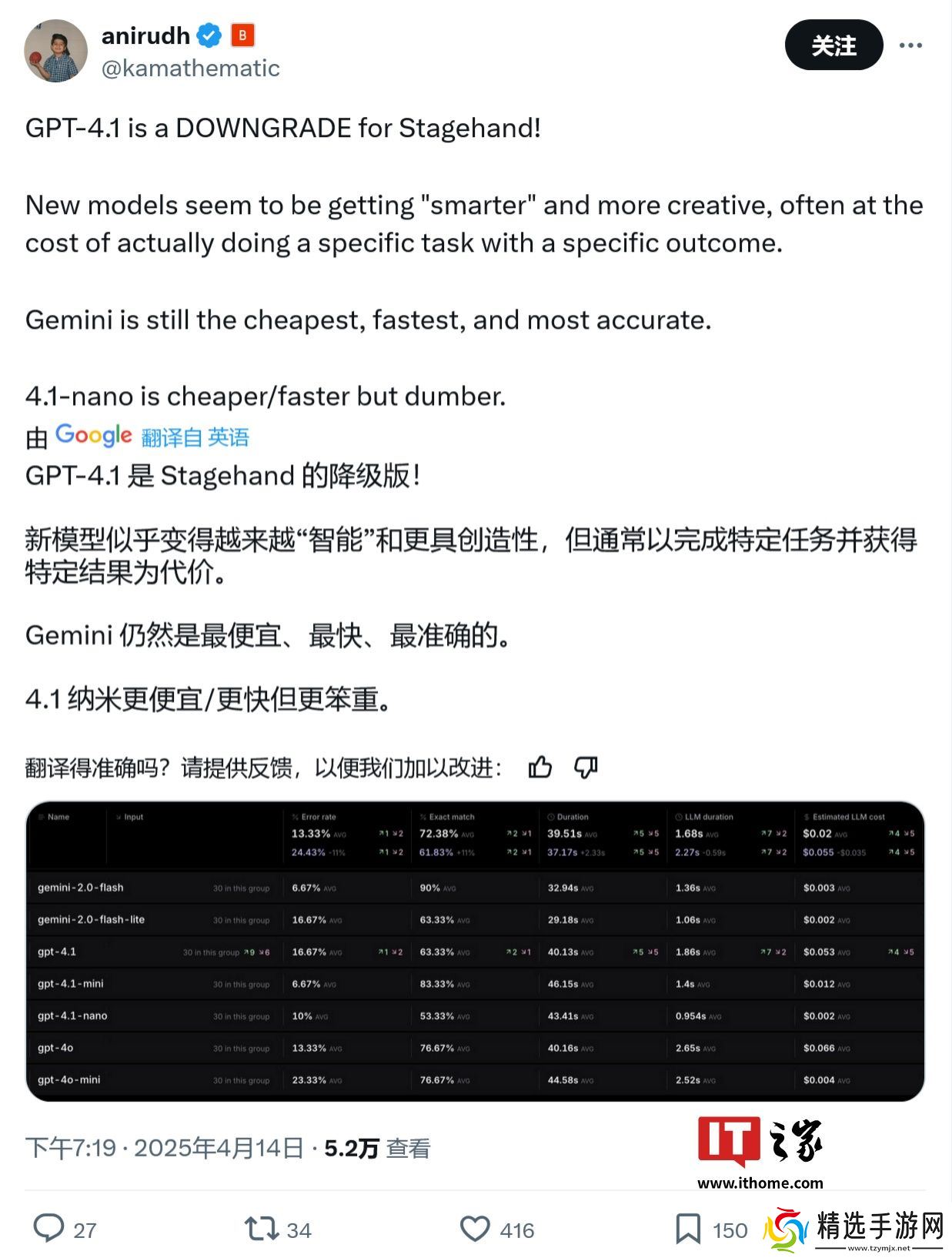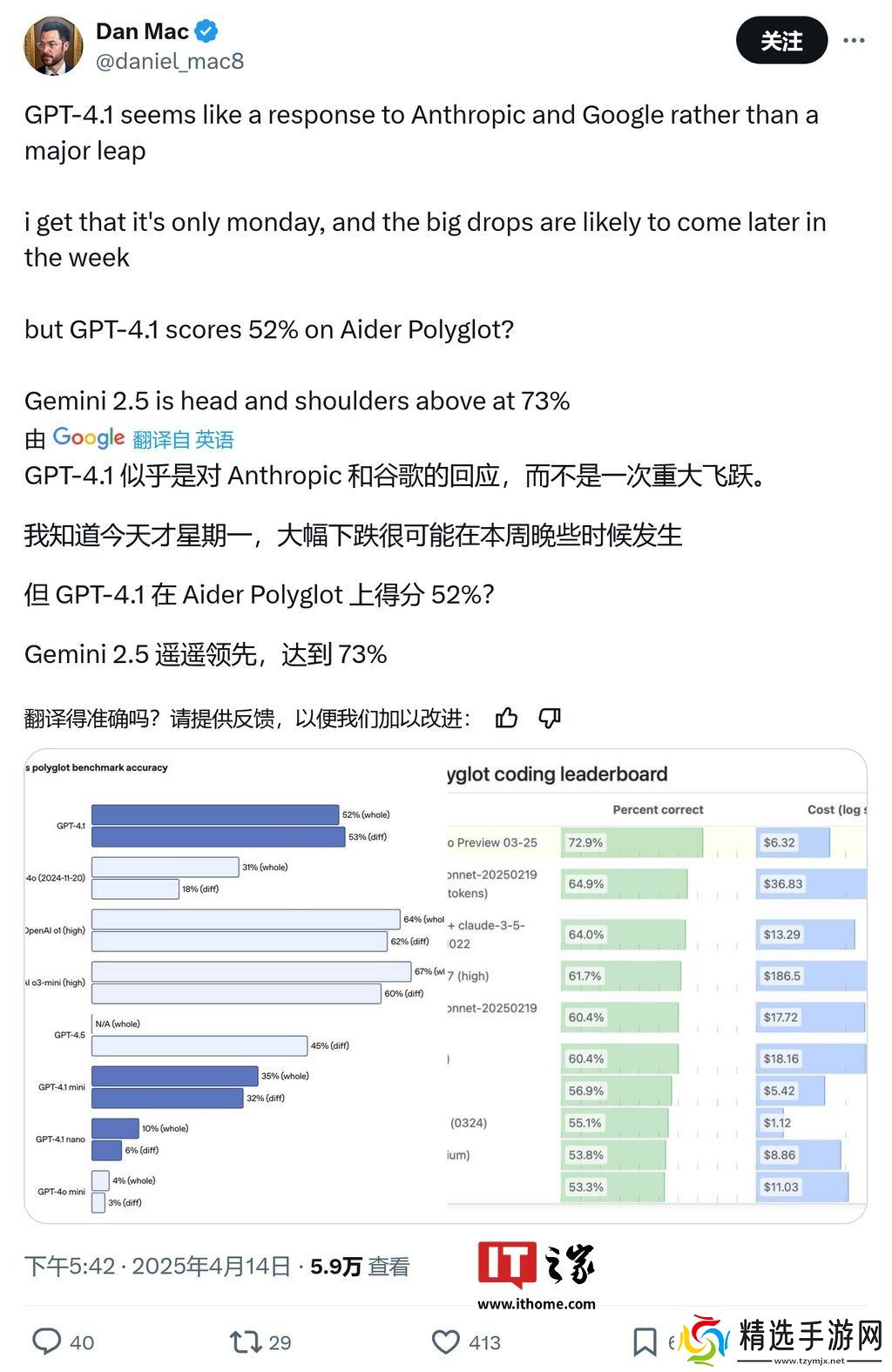 此外,哈佛大学 RNA 科学家 Pierre Bongrand 提供的数据也指出,GPT-4.1 的性价比不及 Gemini 2.0 Flash、Gemini 2.5 Pro 及 DeepSeek 等竞品。