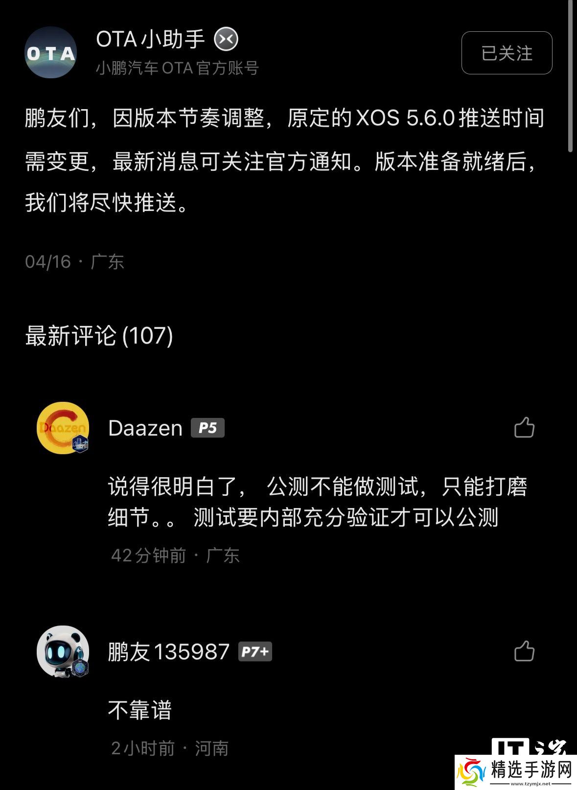 本站 4 月 17 日消息,小鹏汽车 OTA 官方账号 4 月 16 日发布公告,因版本节奏调整,原定的 XOS 5.6.0 推送时间需变更。