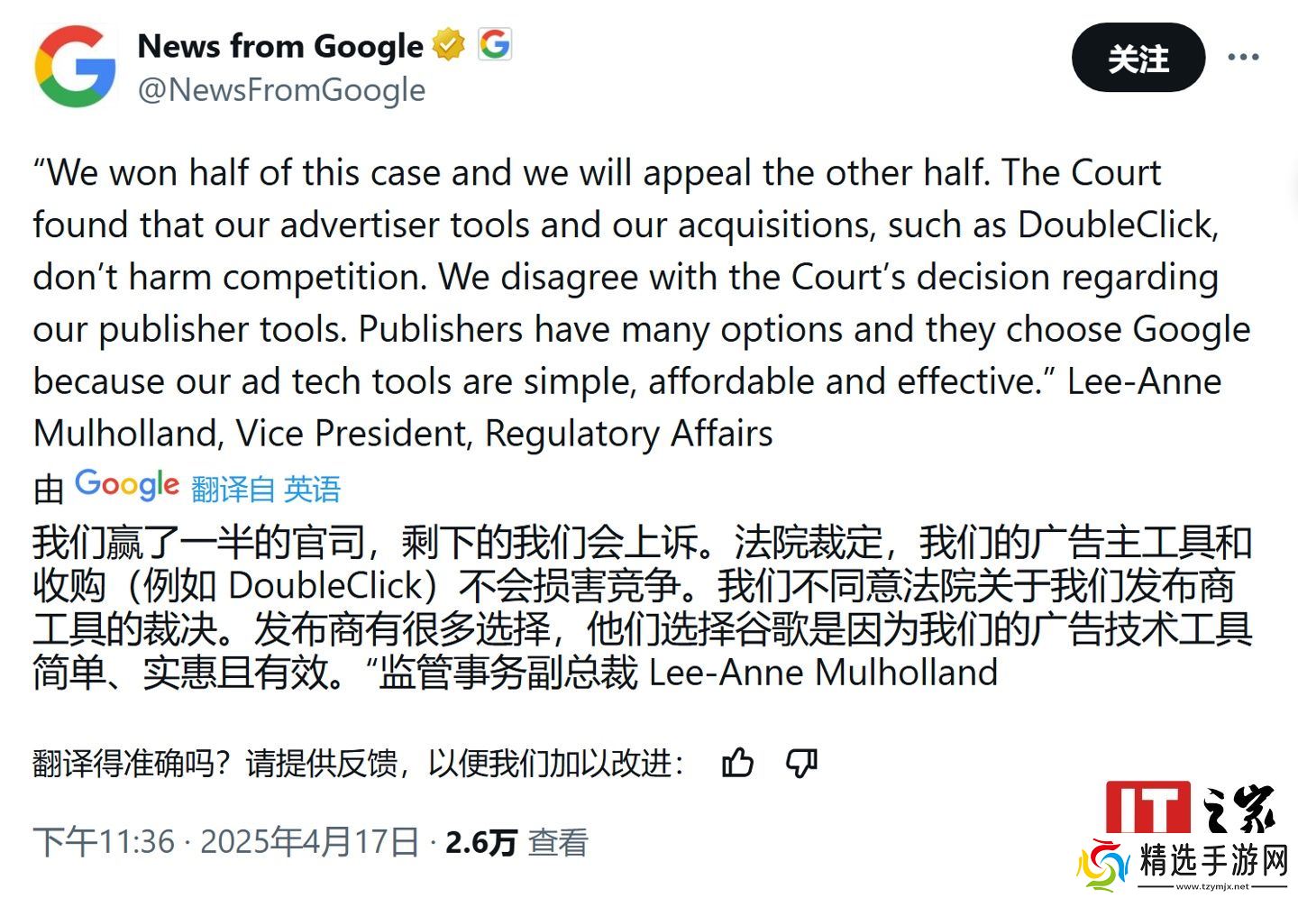 谷歌对此迅速回应,称裁决并非完全不利,并将部分裁决视为胜利。公司副总裁 Lee-Anne Mulholland 通过其 X 账号表示,用户选择谷歌是因为其广告技术工具“简单、实惠且高效”,且谷歌将对裁决中不利部分提起上诉。本站附上推文截图如下: