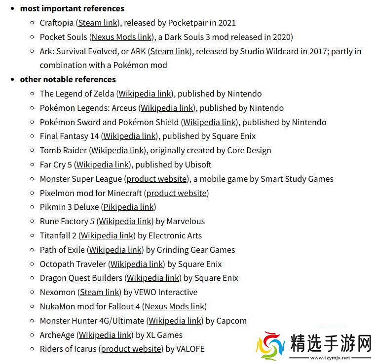 在Pocketpair的辩护清单中,不仅包括了自家的《Craftopia》,还有Studio Wildcard的《ARK: Survival Evolved》、Marvelous的《Rune Factory 5》,甚至任天堂自家的《塞尔达传说》和《宝可梦》系列也被提及。玩家自制的《Minecraft》模组《Pixelmon》和《Fallout 4》模组《Nukamon》同样被纳入其中。