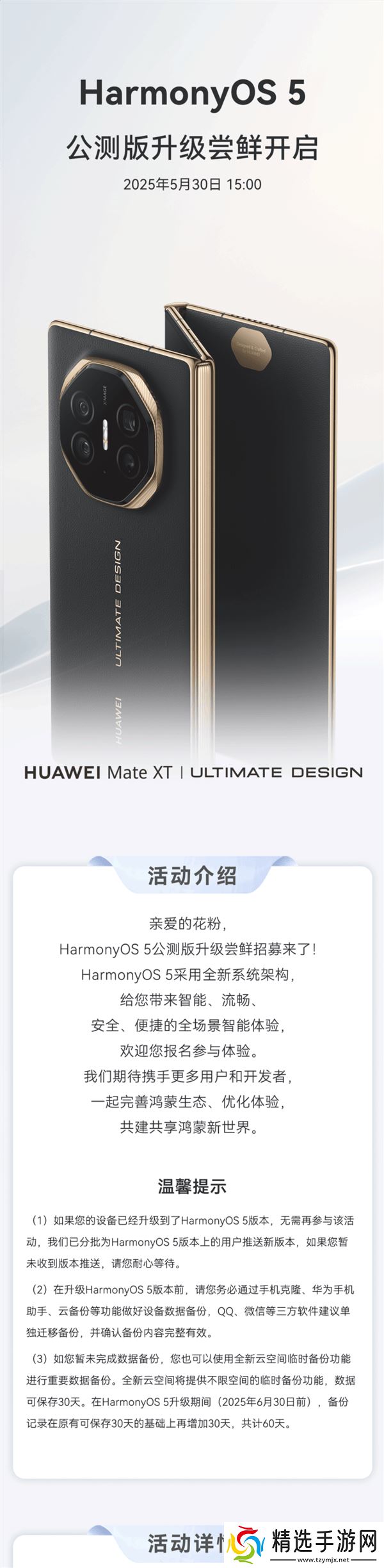 随着测试的不断深入,华为正式宣布Mate XT系列现已进入HarmonyOS 5公测版尝鲜升级阶段,这意味着所有Mate XT用户均有机会参与此次升级活动。这一消息的发布,标志着HarmonyOS 5的覆盖范围正在迅速扩大,更多用户将有机会体验到这一创新系统的魅力。