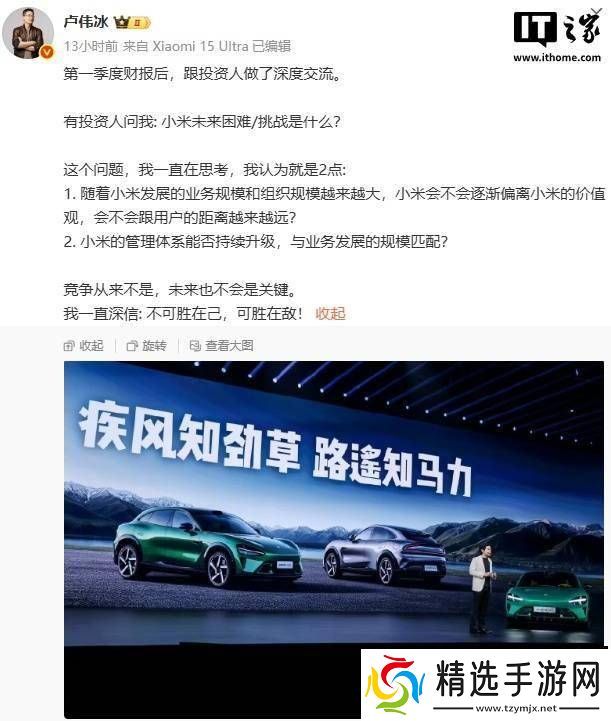 近期,小米集团总裁卢伟冰在社交媒体上分享了他与投资者就小米未来面临的挑战所进行的深入对话。这一交流发生在小米发布第一季度财报之后,引起了广泛关注。