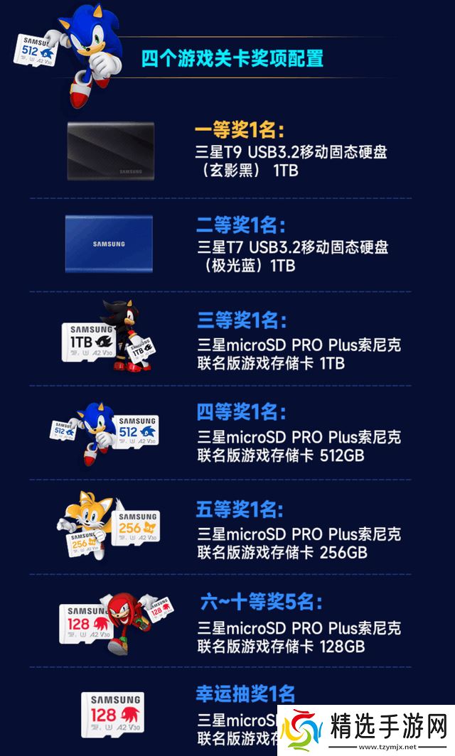本次赛事的奖品设置丰富多样,且极具吸引力。每个游戏会场的前十名玩家均可获得由三星存储提供的精美奖品,包括三星T9 USB3.2移动固态硬盘(玄影黑)1TB(一等奖)、三星T7 USB3.2移动固态硬盘(极光蓝)1TB(二等奖),以及三星microSD PRO Plus索尼克联名版游戏存储卡(三等奖至十等奖,容量从1TB至128GB不等)。特别三星microSD PRO Plus索尼克联名版游戏存储卡是三星与世嘉(SEGA)的联名新品,其读写速度分别可达180MB/s和130MB/s,能够大幅提升Switch掌机的加载速度。卡面设计融入了索尼克家族的经典角色,既实用又具收藏价值。
