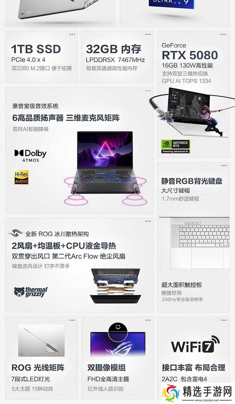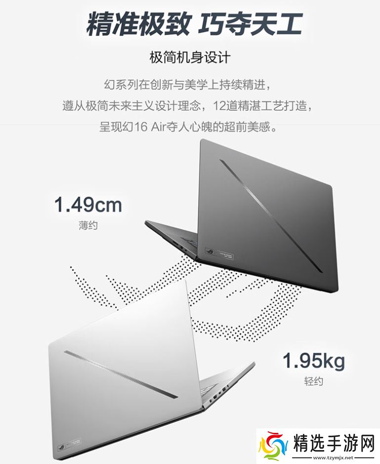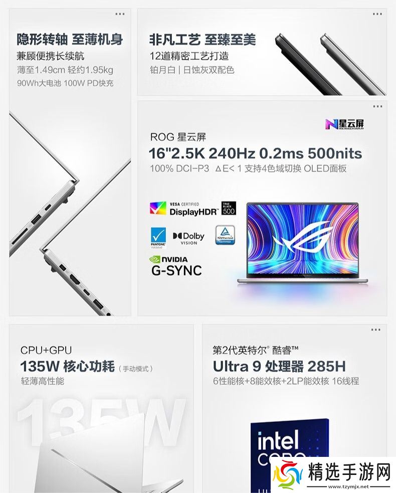 据介绍,这款笔记本可选铂月白 / 日蚀灰两种配色,笔记本使用航空铝一体化机身,A 面配备ROG光显矩阵灯效,整体重量1.95kg、厚度1.49cm,内置6扬声器,配备90Wh电池,支持100W PD快充。
