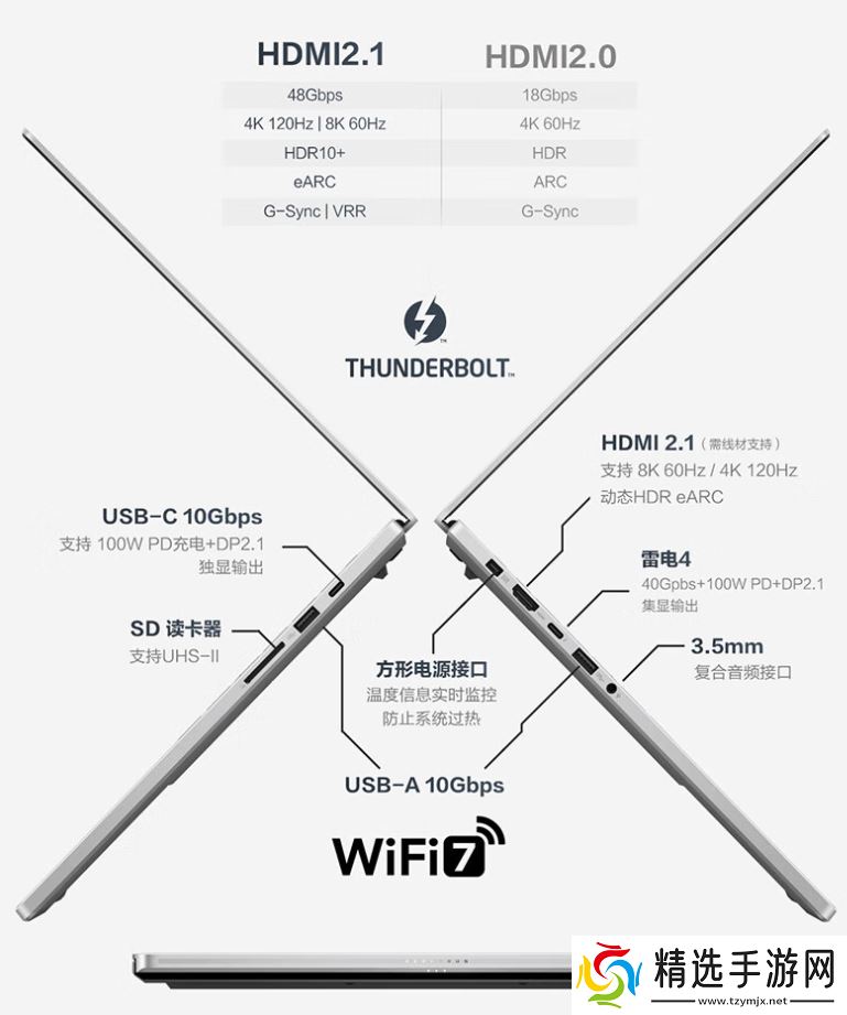 I/O方面,该机左侧配备1个 HDMI 2.1接口、1 个雷电 4 接口、1个 USB-A 10Gbps接口、1个 3.5mm音频接口;右侧配备1个 USB-C 10Gbps接口、1个 USB-A 10Gbps接口、1个 SD卡读卡器。