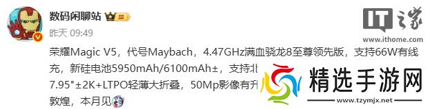 本站 6 月 5 日消息,博主@数码闲聊站 昨日曝光荣耀 Magic V5 折叠屏手机的主要规格,并称“本月见”。