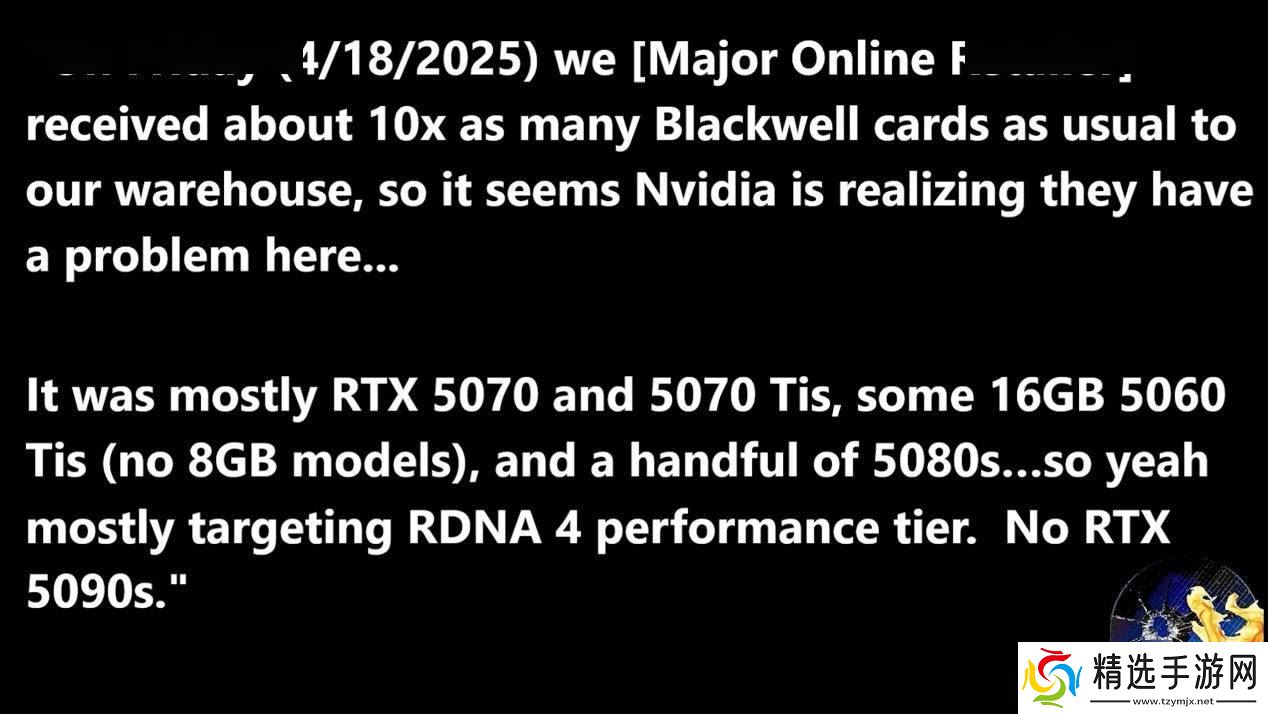 据Moore"s Law Is Dead援引“主要线上零售商”的消息称,英伟达在4月18日向渠道商输送了大量Blackwell架构的显卡,其中包括RTX 5070、RTX 5070 Ti以及16GB显存版本的RTX 5060 Ti等型号。值得注意的是,这次补货并未包含备受瞩目的旗舰型号RTX 5090以及争议较大的8GB显存版本RTX 5060 Ti。