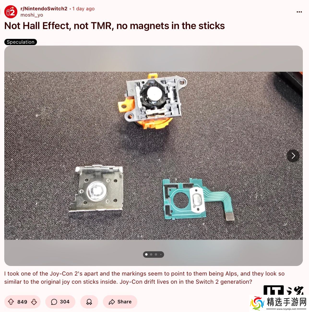 本站 6 月 6 日消息,玩家 moshi_yo 昨日于社媒 Reddit 发布了任天堂 Switch 2 Joy-Con 2 手柄的拆机图,确认其并未使用霍尔效应摇杆。