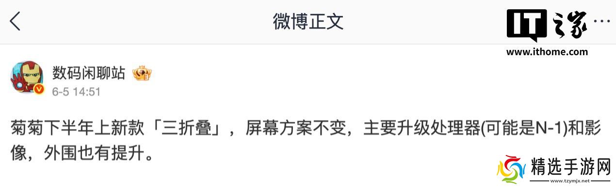 菊菊下半年上新款「三折叠」,屏幕方案不变,主要升级处理器 (可能是 N-1) 和影像,外围也有提升。