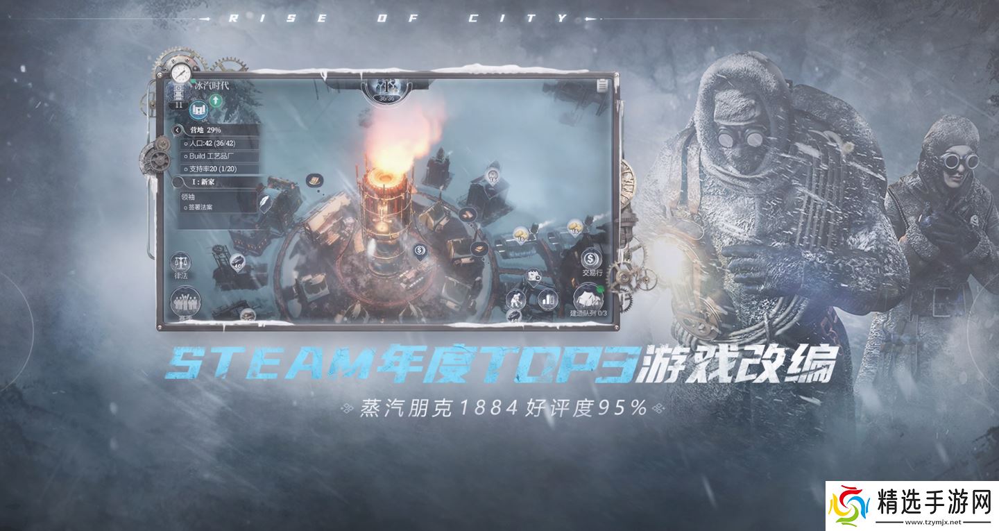 游戏的背景设立在 19 世纪的蒸汽时代,全球遭遇了冰霜危机,气候已经降低至 -150℃,游戏内也仅剩下了最后一座城市,你作为这个城市的领袖,需要肩负起人类生存发展的任务。